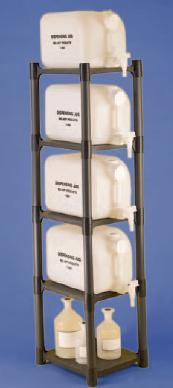 Jerricans and Bottles This rugged, corrosion-resistant rack has 5 shelves for maximum storage efficiency. Ideal for stacking four dispensing jugs (H11850) with a bottom shelf to hold a spare jug or other equipment. Each shelf is 26cm