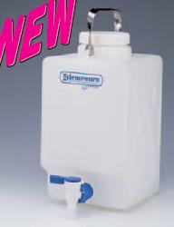 This polypropylene carboy has a half-turn spigot and a folding metal carrying handle. A molded thread accepts the spigot. The large diameter screw cap has a silicone gasket for good sealing and provides a neck opening of 82.5mm (31/4"). Good chemical resistance allows the carboy to be used to dispense sterile water, solutions and media. Rectangular