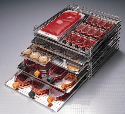 Modular rack and tray system maximizes storage of Petri dishes and cell culture flasks in incubators, cold rooms or the bench. Choose from two types of racks; one supports three levels of trays to hold taller items such as tissue culture flasks, the other supports five levels of trays to hold shorter items such as dishes and plates.